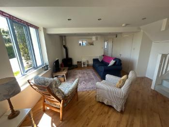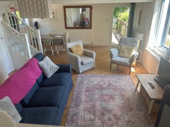 Large living/dining room. One large comfortable sofa. Two armchairs.