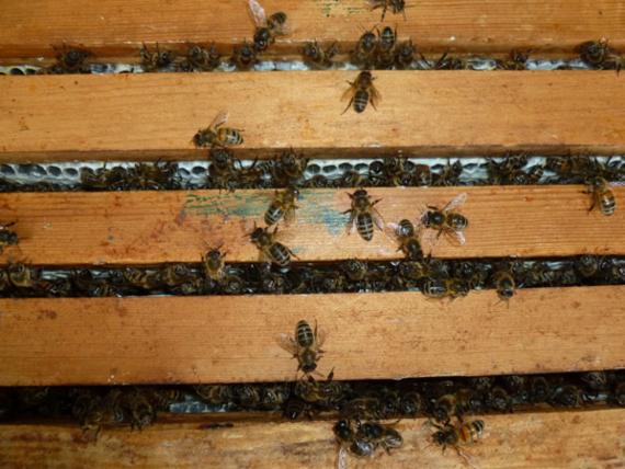 Inside of the hive, bees filling there frames with honey.